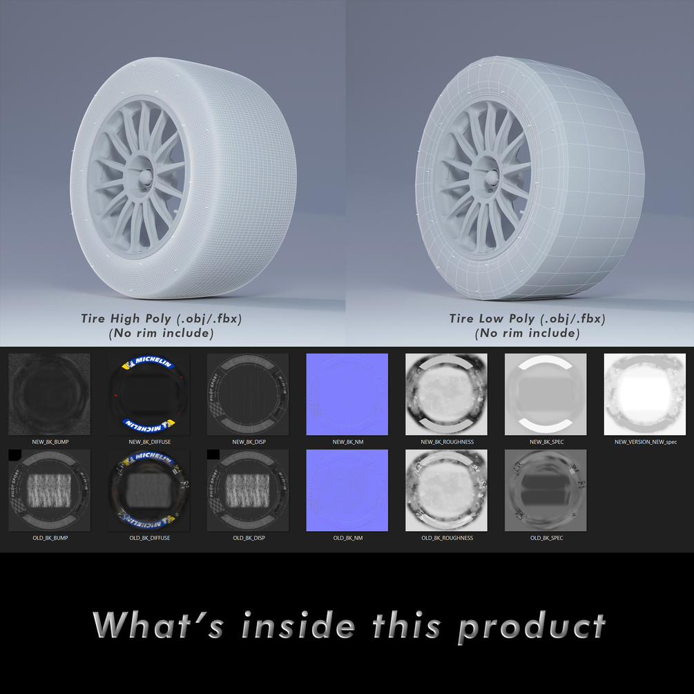 - 8K Textures for New and Old version of the tire. For each version there are : Diffuse, Spec, Roughness, Bump, Normal and Displacement.